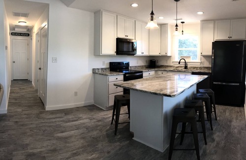 Relax after a long day of exploring, fishing, birdwatching, beach combing, swimming and surfing on comfortable leather sectional couch with 4 reclining seats and 55 inch TV or prepare a family feast in a kitchen that includes the newest Whirlpool black stainless steel appliances, granite countertops & open island seating area.