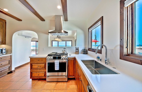 A series of custom finishes shaped this short-term vacation residence into the oceanfront destination you're searching for in San Diego's coveted Mission Beach neighborhood. A warm ambiance embraces you upon entering this two-story abode with a 6-bedroom, 4-bath layout, making you realize there's room for everyone. Feel the coastal breeze from your living area exquisitely crafted for relaxation with inviting spaces, like the large. famous Boardwalk facing patio, smart TVs, air conditioning, and a fireplace. Extensive glass sliders unveil the panoramic views in your dining room, fitted with an array of chandeliers, an ideal setting while relishing delicious meals. Striking exposed beams, modern stainless-steel appliances, ample cabinetry, and gleaming countertops embellish your brand-new kitchen.
