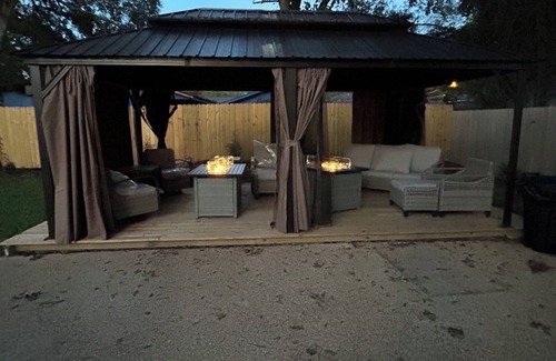 Large deck leading to a charming gazebo fully furnished and 2 fire pits. Enjoy a colorful display of LED lights around the privacy fence. This is your place to be. Easy access to everything.