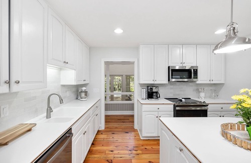 The fully equipped kitchen has been thoughtfully supplied to cater to your culinary needs. It features stainless appliances, ample counter space, and window seating. For al fresco dining, a screened porch sits just outside the kitchen area. In addition, there is a more formal dining table with plenty of seating.