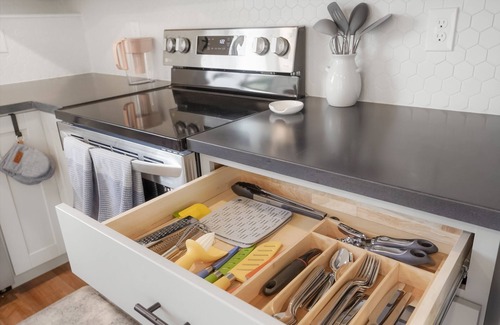 As you enter the unit, to your left you will notice the kitchen with brand new full-size dishwasher, 5-burner electric range w/ oven and microwave, and fridge. We also provide pots and pans, plates and bowls, utensils and cutlery to prepare and enjoy your meals at the dining table to your right.