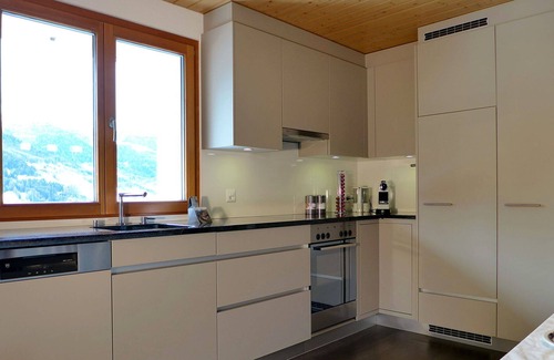 The open kitchen is well-equipped with an oven, dishwasher, four ceramic glass hob hotplates, toaster, kettle, electric coffee machine, raclette grill, and a fondue set (chinoise, cheese). Capsules for the coffee machine (Nespresso) are available at an extra cost. The apartment also features a shower/WC, wood heating, and carpeted floors. Outside, you'll find a large terrace with furniture and deck chairs, offering a marvelous panoramic view of the mountains, valley, and countryside. Other amenities included are a washing machine, dryer, children's high chair, baby cot (extra), hair dryer, and free logs for the wood stove. Wi-Fi internet access is provided free of charge, and there is reserved parking for one car.