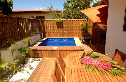 Very pretty F2 with terrace and private swimming pool in a calm and flowery setting less than 1 km from the beach offering a Creole table d'hôte service on request.