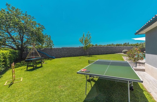 In the garden you will find a sun terrace and an outdoor kitchen so that you can eat and cook outside. The elegant pool has a separate area for children, from which water overflows into the pool. There is also a wellness area with sauna and whirlpool.