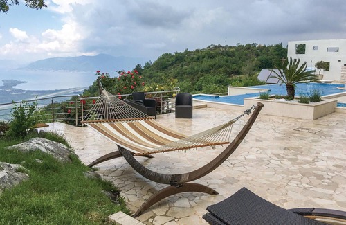 Unrivalled panoramic views of the Bay of Tivat, the marina and the town of Kotor can be enjoyed from this imposing 10,000 m² property, which is exclusively at your disposal. Relax in this stylish holiday home, which consists of three separate residential buildings and can welcome 20 people, so that several families can spend their holiday together and still maintain their privacy. The accommodation can also be used for team building for smaller companies. The main house has a covered terrace with barbecue, a kitchen on the ground floor and a large dining area on the first floor. Three bedrooms, a bathroom and access to a terrace are located on the second floor.