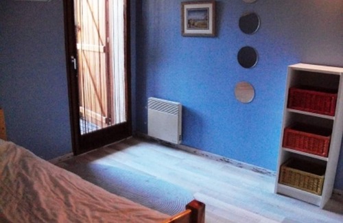 Bedroom 2: 2 beds of 90 cm trundle, storage unit, electric convector. French window with curtain and wooden shutter giving access to a balcony.