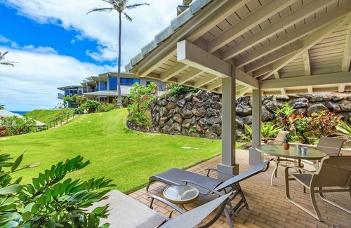 Hale Un Lugar Celestial is a 1 bedroom villa has approximately 1,118 square feet of living space including the 125 sq ft added when one of the balconies in the master bedroom was enclosed to the interior. The outside patio area or lanai, is an additional 379 sq ft. This is an End Unit with the entrance on the ground floor with new bamboo cabinets and custom granite counter-tops in the remodeled kitchen. The downstairs powder bath has an expanded tile shower big enough for extra guests or extended family. There is an expansive living and dining space with eclectic but quality island style decor infused with the modern amenities like the new 60" LED TV and Blu-ray DVD. The master bedroom and bathroom are upstairs on the second floor with no other units above and only one shared dense concrete wall on one side. This floor-plan allows the guest to wake up in the morning and enjoy a gorgeous ocean view from the comfort of your cozy custom hand carved king sized bed. The only thing between you and the ocean is the ocean front pool, one of 3 pools in this complex. All pools have 'Weber' gas bar-b-q grills and kitchenettes for your use. Your access to this locked and gated amenity is VERY convenient! There is also a wonderful ocean front coastal trail that parallels the shoreline just beyond the grounds.