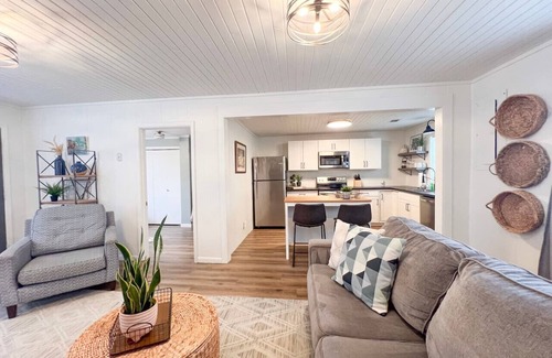 The living room and kitchen are open concept with plenty of space to relax or cook. In the bedroom you'll find a queen bed with new memory foam mattress and plenty of closet space. The bathroom has a tub shower combo and a washer dryer in the closet for your use. Just behind the house you'll find a private area with seating on the small patio.