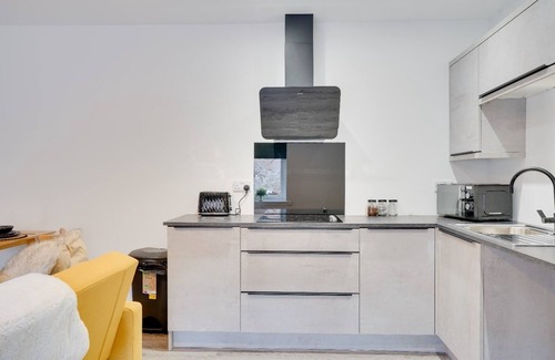 The fully equipped kitchen includes an oven, hob, microwave, kettle, and an integrated fridge, providing all the essentials for a comfortable stay.