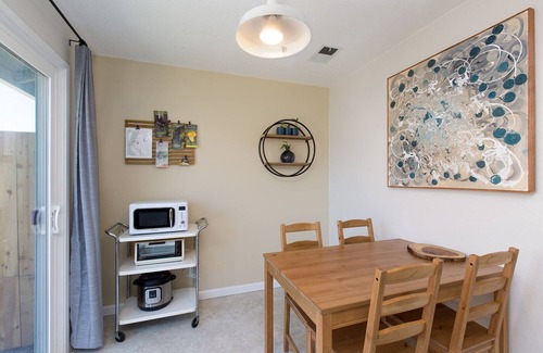 The North Fork Cottage is a well appointed 2 bed 1 bath cottage in a newly remodeled duplex. Enjoy our quiet and convenient central Eureka location as your home base for exploring Eureka, Arcata and our beautiful surrounding redwood forests, beaches and rivers! You'll enter the home to the living room with a spacious l-shaped couch and smart TV. Across from the living room is a lounge room with small wet bar to wind down in the evening or use the desk and work space to be productive during the day. The kitchen and dining room are complete with fridge/freezer, electric stove/oven, dishwasher, microwave and dining table with seating for 6. There is a laundry room inside of the cottage with a washing machine and dryer. Each bedroom has a queen bed and the living room couch is a queen sized sleeper sofa. The bedroom closets are both spacious and artfully lined with cedar planks.