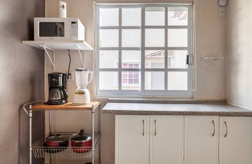 Cocina integral equipada, refrigerador, microondas, cafetera y utensilios de cocina.