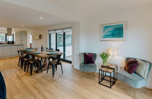 Designed for modern living, the residence features expansive open-plan living spaces, where guests can gather and unwind amidst tasteful furnishings and elegant decor. The heart of this home features a stylish kitchen, generous dining table and plush oversized sofa. All centred around a cosy wood burner, creating an atmosphere of warmth and comfort.