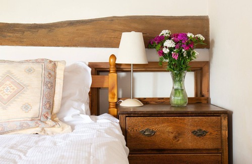 This front-facing bedroom features original oak beams and a wooden ceiling. The super-king size bed (can be twin beds on request) faces the deep window which is the perfect place to perch and watch the sheep playing in the field beyond. There's a hanging rail for clothes and a bedside table with a reading lamp.