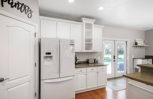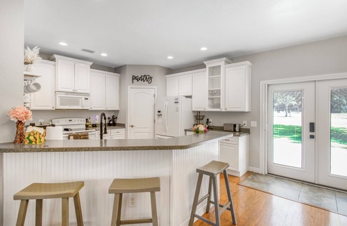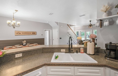 Downstairs, you'll find a spacious living room with a cozy leather sectional and a smart TV, perfect for family movie nights. The fully equipped kitchen boasts high-end appliances, including a KitchenAid blender, Instapot, dual coffee machine for Keurig and drip coffee with a frother, and a variety of spices. Bar seating for three makes it easy to enjoy casual meals. A convenient laundry room, half bath, and the owner's suite with a private bathroom and walk-in closet are also located on the main floor.
