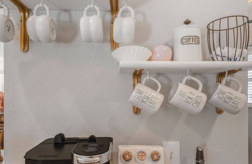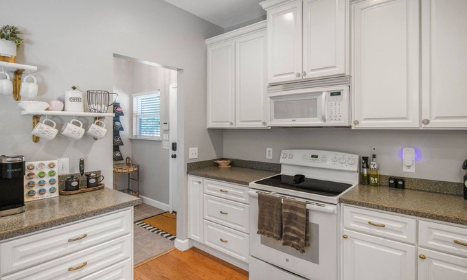 The property features a relaxing outdoor seating area on the back patio, as well as a cozy porch swing and chairs on the front porch, complete with a covered area and ceiling fan. A gas BBQ grill is available for outdoor cooking, and a beautiful 2-mile walk awaits you, with part of the path shaded by a serene tree-covered canopy. We provide super-fast Wi-Fi, along with complimentary toiletries, coffee, coffee pods, creamer, and a variety of spices to enhance your stay.