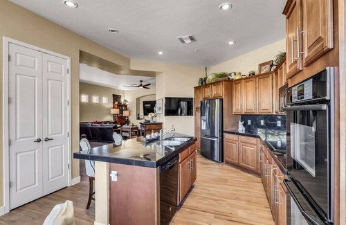 Spacious great room opening up to the backyard oasis with mountain views and private pool and waterfall. Ceramic wood planking throughout. The home offers 3 spacious bedrooms. The main bedroom has a office space with desk, monitor and office chair and flows into an oversized bathroom and walk in closet. The second bedroom with ensuite bathroom has a queen bed, barn door and computer monitor.