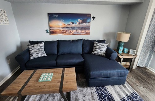 Ocean View! Just 90 steps to the beach, this stylish 1BR condo (sleeps 6) is the perfect coastal escape. Enjoy morning coffee, evening cocktails, or meals on the private balcony with ocean views of dolphins passing by. Unit 203: WiFi, flat-screen TVs, fully equipped kitchen, washer/dryer, hair dryer, fresh towels & sheets. Condo amenities: Elevator, heated indoor pool, game room, luggage carts & free covered parking. Close to dining, shopping & entertainment. NO PETS Memorial Day–Labor Day.