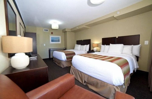 Traveling with friends or family? This ocean-view suite features two bedrooms, one with a king bed and the other with two queens. Our guests will enjoy the convenience of a full kitchen (no stove) and a spacious bathroom. The private balcony is 36 feet long and has a great view of the beach!