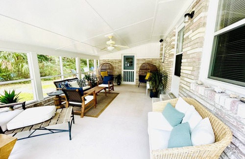 Tranquil SeaClusion is your idyllic, beach escape - a one story classic 1960’s cottage, tucked in among tropical palms and a shade canopy of live oaks. Rest, relax, and enjoy the serene beauty of this property. Discover your inner play and hop on one of the beach cruisers to explore the serene streets. At night, sit by the moonlit sea or enjoy watching the big game on the 50” flatscreen in the designated the game room and arcade lounge, which has shuffleboard, skeeball, four arcades, and foosball! You’ll find peaceful moments on the “sip something” yard swing, with an ocean view. A cheery fireplace wraps up slow sweet days of doing nothing. The beach, restaurants, pier, a coffee shop, and library are all short walks. Grocery stores, parks, shops and boutiques, bars, golf, recreation center, putt-putt, and more are all close by as well! Tranquil SeaClusion will be your idea of paradise. Enjoy your stay!