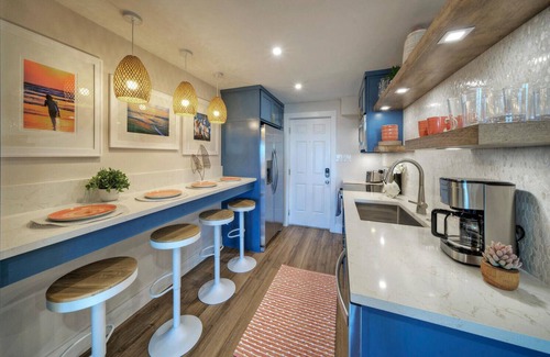 Welcome to Summer Love! Summer Love is a completely remodeled 2nd-floor condo with breathtaking gulf views. Beautifully decorated, this spacious studio boasts chic decor and vibrant pops of color. Summer Love has 1 king bed and a full sleeper sofa, accommodating up to 4 guests. Prepare home-cooked meals in the fully equipped kitchen, adorned in stunning blue cabinetry, and dine at the breakfast bar. Blue accents continue into the full bathroom, which boasts sleek finishes and a glass walk-in shower. Step out to your private balcony, where you can enjoy beach and ocean views from the Adirondack chairs.
