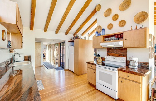 It may be tough to pull yourself away from the hot tub, which is situated in the private, enclosed, wind-protected courtyard with a view of the ocean and made cozy with greenery from the nearby courtyard garden. The living room is drenched in sunlight from the vertical grain fir floors to the vaulted ceilings and has an expansive view of the ocean. A long ocean facing wall of large windows flood tons of natural light into the living and dining areas. Complimentary high-speed (1 Gigabyte) fiber-optic WiFi is also provided to keep you connected to friends and family. Additional WiFi nodes also have been installed to extend fast WiFi throughout the home and the enclosed courtyard. Telephone service (VOIP) is included as well, with free long distance calling within the continental United States (excluding Alaska and Puerto Rico).