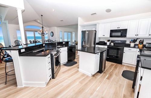 Top Level: Features a beautifully decorated great room with magnificent ocean views and fireplace. The entertainment system is complete with a large Smart TV and Bluetooth sound system. The dining room has seating for 12 and the gourmet kitchen (updated in 2024) is equipped with every imaginable cooking essential for the definitive gourmet experience. Granite counter tops with a breakfast bar seating 6, plenty of counter space, double dishwashers, cook tops and ovens, double sinks and ice maker make this area perfect for entertaining a large group. There is a separate breakfast area seating 6 in the beautiful sun room that is furnished with a Queen Sleep Sofa. Guests will enjoy the large oceanfront deck with it's outdoor dining table for 8 and rocking chairs. The Soundside deck offers a cafe table, rockers and a gas grill. The King Master Bedroom is equipped with a Roku TV, private deck and spacious bathroom with a Jacuzzi tub and over-sized shower.