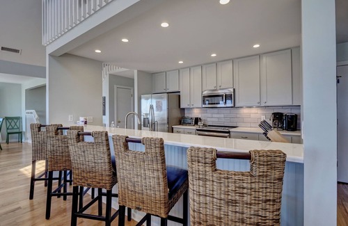 Just steps to the beach, this lovely home offers panoramic views of the ocean with a wide front porch to enjoy the scenery. completely renovated in 2020, Seawinds offers beautiful interior space, new furnishings and the same wonderful views of the ocean,. Traditional floor plan with an upstairs loft. Enjoy walking along the Atlantic Ocean, and the easy commute to the sandy beach. Everyone, including four-legged members of the party will enjoy shady rest inside while viewing out the expansive living room windows to the ocean outside. Sleeps 10 (max.). 4 bedrooms, with additional sleeping in loft. (1K-1K-1K-1Q-1BB). 3 baths. 2 (4) passenger cart. High Speed Internet. Pet Friendly. Adjacent to beach access. Friday/Friday. 4:30 p.m. arrival/9:30 a.m. departure.