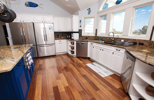 Top Level: Great room with a large flat-screen TV/DVD, gas fireplace and deck access and the ship's watch with a sitting area and desk. Kitchen with 2 ovens, warming drawer, 2 dishwashers, 2 refrigerators and counter seating for 4, bar with seating for 3 and dining area seating 14 with deck access to the screened porch. Half bath and exterior spiral stairs to a widows walk with sound views. King Master Bedroom with flat-screen TV, deck access and a large private bathroom with a whirlpool tub, stand-up shower, double vanities and private balcony deck.