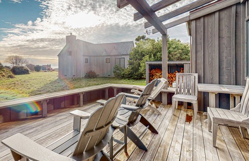 Where the exterior was designed to resemble a country barn, the interior is full of warm natural woods, stainless steel appliances, and large windows that frame the ocean and meadows. Ease into the day with a soak in the jetted tub, bring your coffee outside to one of the furnished decks, and take sunset strolls to Walk On Beach before preparing dinner in the elegant open kitchen. You can even use the free WiFi as you relax by the fire.