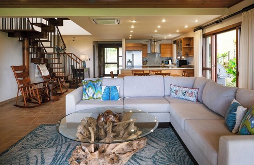 Ridge Townhome 15 offers ocean views and a peaceful two-story retreat that blends tropical luxury with everyday comfort, featuring a renovated modern kitchen, updated bathrooms, fresh furnishings, and wood-accented ceilings in the living room.