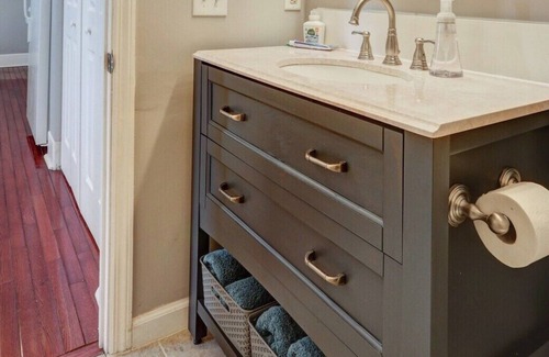 Enjoy the full, private bathroom with washcloths and towels. Provided for your convenience is body wash, shampoo and conditioner.