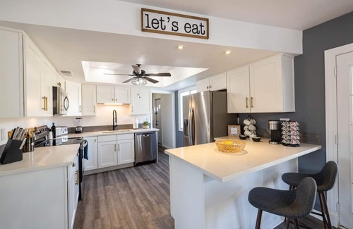 Kitchen: Fully stocked with stainless steel appliances, Quartz countertops, Keurig coffee maker (K-Cups supplied), tea kettle, and essential cooking supplies