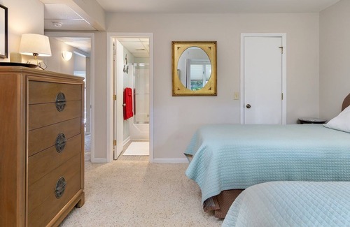 Master bedroom has a queen size bed. Guest choice of a pair of twin beds or a single king size bed in 2nd bedroom. Second bathroom access from hallway as well as private entrance from second bedroom.
