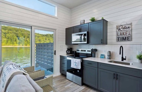 Check out this brand new Floathouzz right on beautiful Lake Cumberland! Steps away from the lake...The Gray On Water 20 can sleep the entire family, friends and more! On the main level you have a full kitchen, living room with tv and sleeper sofa, master bedroom with a kind bed and master bath, and a secondarily bathroom. On the lower level you have 2 bedrooms each including 2 queen size beds. The loft is the perfect place for all the kiddos featuring 3 queen beds and a twin bed!