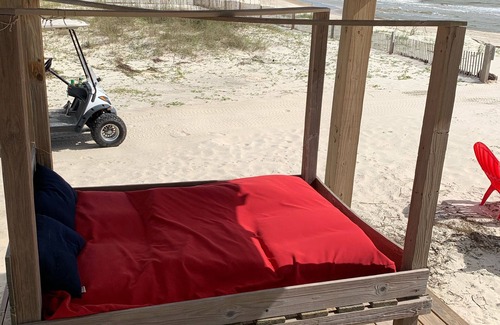 Private beach hut on the gulf side of the property with a bed, picnic table and lounge chairs.