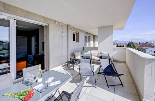 New vacation home in the Opalia Residence - Gardalake Lifestyle. Opalia Residence offers a modern living concept with fitness room, co-working space, roof top pool with magical views of Lake Garda and the mountains. You can also enjoy the view of the lake from the terrace of the flat. The flat is perfect for couples and has a bedroom, large bathroom, living and dining area with a large terrace to relax. The kitchen is fully equipped with dishwasher, cooker, oven, cooking utensils and capsule coffee machine. The flat is fully air-conditioned and also offers a washing machine in the flat and a dryer in the communal laundry room. There is a private garage for your car, wifi and a smart TV. Enjoy your breakfast on the large terrace and relax by the large pool. There you will also find showers and changing room as well as sun loungers (2 per flat).In the immediate vicinity you will find many shops, restaurants and the weekly farmers' market, as well as a pharmacy, hairdresser and caffeés. You can walk to the lake in about 5 minutes and to the centre of Peschiera del Garda in about 30 minutes.