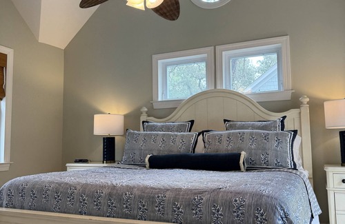 Marina, Ferry and Restaurants. Home is nestled among trees on the golf course. Four bedroom home with two masters with their own bathrooms , two bedrooms have Jack and Jill style bathroom that they share and another one half bath upstairs off kitchen. Two levels of decks, an additional screened in porch to watch the golfers down below. Well stocked kitchen with large dining table that seats eight. Sleeping layout accommodates 12 guests. One King, one queen, two doubles, one twin, two pull out sofas. Two golf carts to use, one six person, and one four person. Outside shower beside garage. Beach access is only minutes away by golf cart. Temporary memberships available for purchase with the Bald Head Club during your stay.
