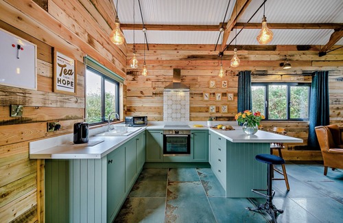 Leave boots and coats in the porch and step into the open-plan living area with its impressive, beamed ceiling. A lot of thought and care has gone into making this a beautiful and welcoming retreat. Designed with space in mind, the lounge area is a delightful spot with mood lighting, scorched hand-clad wood, and attractive furnishings creating a sense of style and comfort. Relax on the sofa and gaze at the views, or unwind with a film on the TV. Overlooking the lounge, a sleek kitchen is drenched in natural light and features a breakfast bar with seating for two people. If the weather is good, you’ll want to dine outside at the patio table with the fantastic, uninterrupted countryside views as a backdrop. The bedroom is situated off from the living area and features a double bed. Furnished in earthy tones, it’s a serene space where you can gaze across the garden from the comfort of your bed. It also boasts a fabulous en-suite shower room with a double walk-in shower.