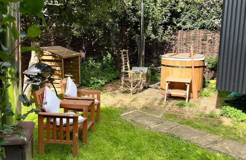 Outside there is a Webber gas bbq , firepit , wood burning hot tub and outdoor seating and a picnic bench