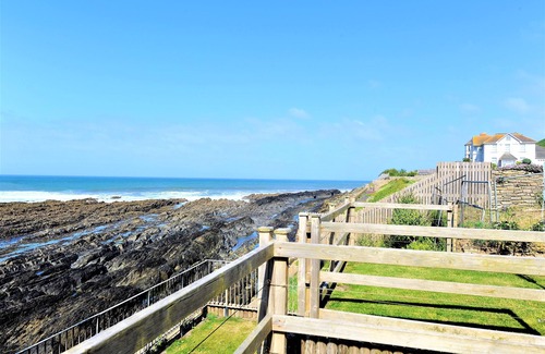 This very special house is situated at the far end on the seaward side of ‘Out of the Blue’, so has direct views of both the ocean and the bay near the National Trust headland of Baggy Point. A slipway at the side of the car parking area reaches the beach.