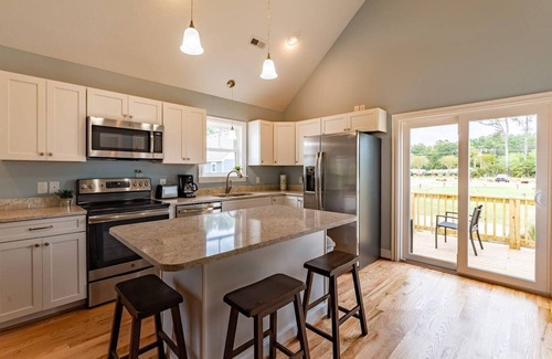 In addition to a gourmet kitchen and beautiful living/dining area, each cottage has 2 bedrooms and 2 full bathrooms downstairs (each bedroom has 2 full-sized beds). There is a loft located up a spiral staircase with 2 additional full-sized beds. The loft area is open to the downstairs living area. There is a gas grill on the back deck. Stacked washer and dryer downstairs.