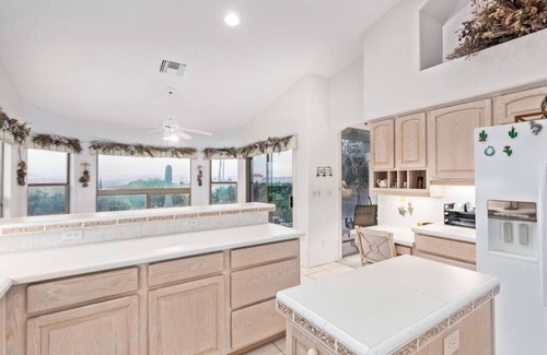 Overlook Delight is situated high atop Fountain Hills and features 3 bedrooms and amazing views! The back patio is perfect for morning coffee and to watch the sunrise over Four Peaks Mountain Range and again at twilight as the majestic mountains change colors with the setting sun. Inside the home you will find a large Master Bedroom with King Bed and ensuite bathroom. A fully stocked kitchen with breakfast nook, formal dining are perfect cooking in. Come take a break and soak in some views!