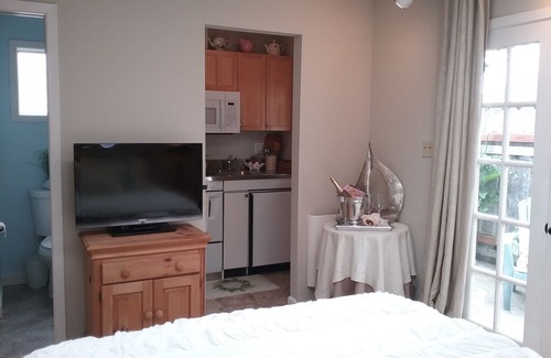 A charming, romantic hideaway for two (efficiency/studio with separate fully-equipped kitchen and bath), close to everything on the Monterey Peninsula: Pebble Beach, Carmel, 17 Mile Drive, etc. Book it for the US Open, the Concourse de Elegance, The Monterey Jazz Festival, The Feast of the Lanterns, etc. The cottage is walking distance to the beach at Lover's Point, and all the quaint little shops, cafes and restaurants of Pacific Grove. Wi-Fi and full Xfinity TV includes HBO, Starz and Showtime. Light, bright and fully equipped with a private entrance, automatic security lighting, French doors to private patio with fruit bearing fig tree, built in computer desk, small kitchen table and 2 chairs, new queen size comfy foam mattress with Charisma and Calvin Klein designer linens, new ceramic bathroom tile flooring, fixtures and large closet for clothes, suitcases and other storage. Brand new, fully equipped kitchen with 4 burner stove, oven, large microwave and compact fridge, which holds a surprising amount for its size. Toaster, kettle, tea pot, coffee maker, glasses, dishes, bowls, pots, pans, cutlery, wine glasses, corkscrew/bottle opener, can opener, cutting boards, salad bowl and tongs, colander, clothes steamer, umbrella, extra blankets. By itself at the back of the property, away from the main house, on a small, quiet street, Sweetheart Cottage for 2 is very private and peaceful. No daily housekeeping. No smoking. No pets. Not kid friendly or appropriate for children. Minimum 30-day rental to same party required by the City of Pacific Grove. $4,000 for part or all of month during high season, April thru October; $3,000 for November through March. Cleaning fee and refundable security deposit.