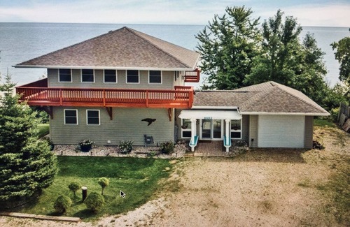 Game shuttle available ! Hi speed WiFi and work from home setup. Enjoy the sights & sounds of Lake Michigan with it's beautiful sunrise (or moonrise!) on over 320 feet of private shoreline on over one private acre, with the lakeshore only 75 feet accessible from the yard! Listen to the waves as you drift off to sleep with patio doors off the master bedroom! The house design comes from a fire lookout tower containing windows all around the top level for 360 degree viewing. Every level has its own bedroom and bathroom. The tower has a large great room with vaulted ceilings, a dining/wet bar area with mini fridge that overlooks the lake for romantic dinners, a gas fireplace, a two person soaking tub, exterior walk around catwalk and a bedroom equipped with two full size beds. The main level has a kitchen/living area with another gas fireplace, full glass shower enclosure with view of the lake from the bathroom and a bedroom with a queen bed, deck with table and umbrella and gas grill. The lower level has the master suite/Queen with two patio doors opening to a private deck with another table, overlooking the lake and its own private bathroom and TV /office/reading area. Enjoy the views from 3 different decks on various levels overlooking the lake. Just 12 miles to Door County shopping and restaurants, plus shops, restaurants, sandy Crescent Beach, Boardwalk, & all the history of nearby Algoma with Wineries, Breweries, the Anahpee Bike Trail, Kayak and paddle board rentals, Golf, and world class fishing charters.Lounge chairs provide a great lakeside retreat, on 3 decks connected to the home. Fire pit and chairs steps from the lake. Note: Security cameras located on property exterior front and back decks. If you're staying to see a Green Bay Packer Game, you can take the Kewaunee County Chamber of Commerce Packer Shuttle to/from the game for $30. Check their website for availability.
