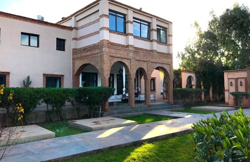 15 minutes away from the Medina of Marrakesh, this magnificent palace is a haven of peace, surrounded by a beautiful park and a sumptuous swimming pool with sun beds to enjoy the sunny days of Marrakesh. Available up to 21 persons with its 10 beautiful bedrooms with large double beds, and 10 beautiful bathrooms are available. Several large living rooms with sofas, armchairs, dining table. Fully air-conditioned, with Wifi Internet and cable TV. The kitchen is fully equipped with fridge, oven, microwave, hob, coffee machine, toaster, kettle, washing machine, dryer, dishwasher. House staff on site and caretaker.