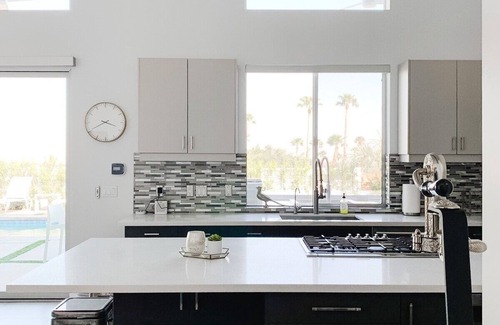 Azul Escape is located in beautiful Palm Springs, California, just minutes from downtown. There are three bedrooms and two and a half bathrooms in the main house, plus an additional bedroom and bathroom in the spacious, detached casita.