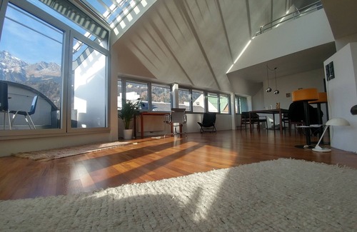 The Penthouse is located in the 4th Floor and easy accessible with an Elevator. The rental area is 160 m2 and includes a very spacious living-dinning area (63m2) with a vintage Italian designer-couch and 2 fauteuils - the living-dinning area with an open-plan kitchen is directly connected to the west-faced terrace with an amazing panoramic view to the mountain scenery of Innsbruck. The height of the ceiling is 6 meters. Above the living room there is a 23m2 open living gallery with a lounge area from from where you have a overview to the mountain scenery as well. The Gallery-Lounge Area on the Gallery can be used as a computer-workplace or can be used as optional sleeping place as well (Futon-Bed)