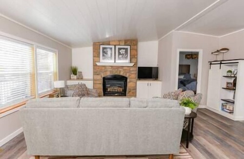 As you step inside, you'll be welcomed by a cozy living room off to your left with a fireplace. The living room features comfortable seating around the stone fireplace, while the dining area offers a large table for group meals and gatherings. The beautifully updated kitchen offers modern appliances, butcher block countertops, and all the cookware and utensils you'll need in order to compete with Dad out on the blackstone.