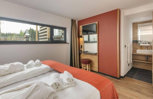 3-room chalet 78 m2 on 2 levels, on the ground floor. Living/dining room with open-hearth fireplace and satellite TV (flat screen). Exit to the terrace. 1 room with 2 beds (90 cm, length 210 cm), shower and satellite TV (flat screen). Kitchen (oven, dishwasher, 4 induction hot plates, toaster, kettle, microwave, electric coffee machine). Sep. WC. No heating option. Upper floor: 1 room with 2 beds (90 cm, length 210 cm), satellite TV (flat screen). Bath/shower, sep. WC, hydro massage bath, Sauna. No heating option. Terrace furniture, balcony furniture, barbecue, covered balcony, box-room. Facilities: washing machine, dryer, safe, children's high chair, baby cot, hair dryer, logs (extra). Internet (WiFi, free). Please note: non-smoking house. Smoke alarm.