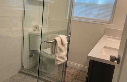 Our modern bathroom is clean and well-maintained, equipped with fresh towels and toiletries to ensure your stay is comfortable. You’ll also find a washer and dryer in the home, so you can pack light and keep your clothes fresh throughout your visit.